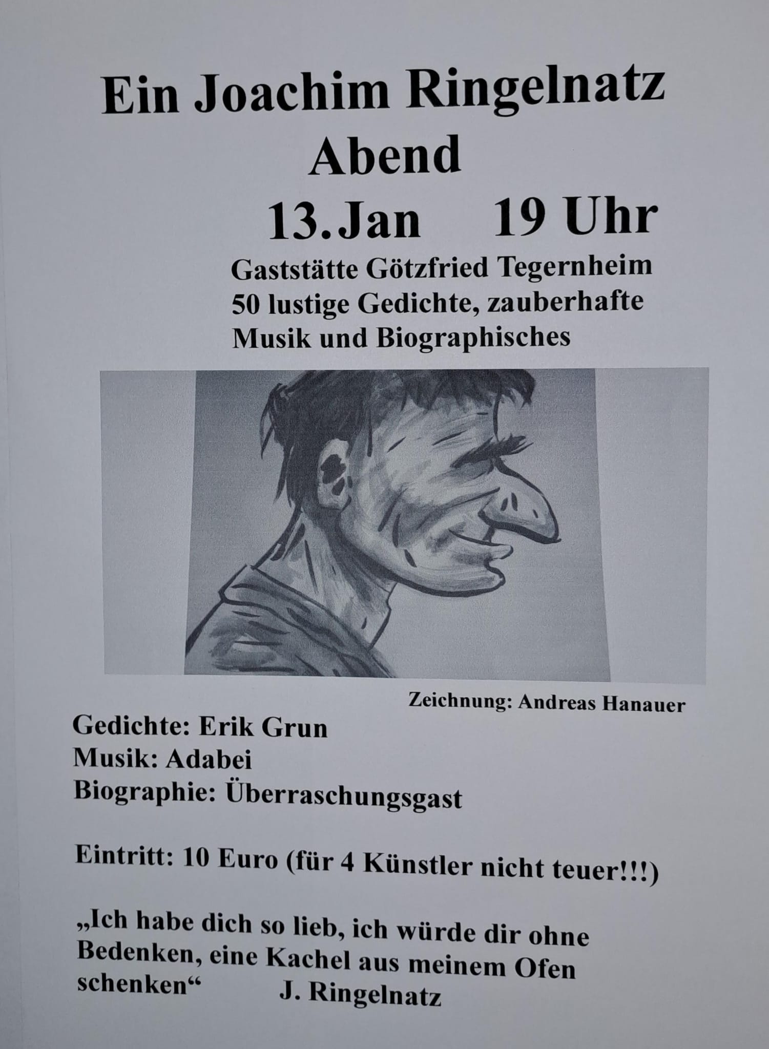 Langsam läuft die Kultur wieder an, auch bei uns: mit einem Joachim-Ringelnatz-Aband mit Erik Grun im Gasthaus Gambachtal in Fußenberg am 25. Juli 2020. Wir freuen uns drauf!